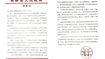 近日,第二十届中国吴桥国际杂技艺术节圆满落下帷幕。吴桥县人民政府特向京沪分公司发来感谢信,对分公司在杂技节期间提供的坚实交通保障与优质服务表示高度肯定与诚挚感谢。[详细]